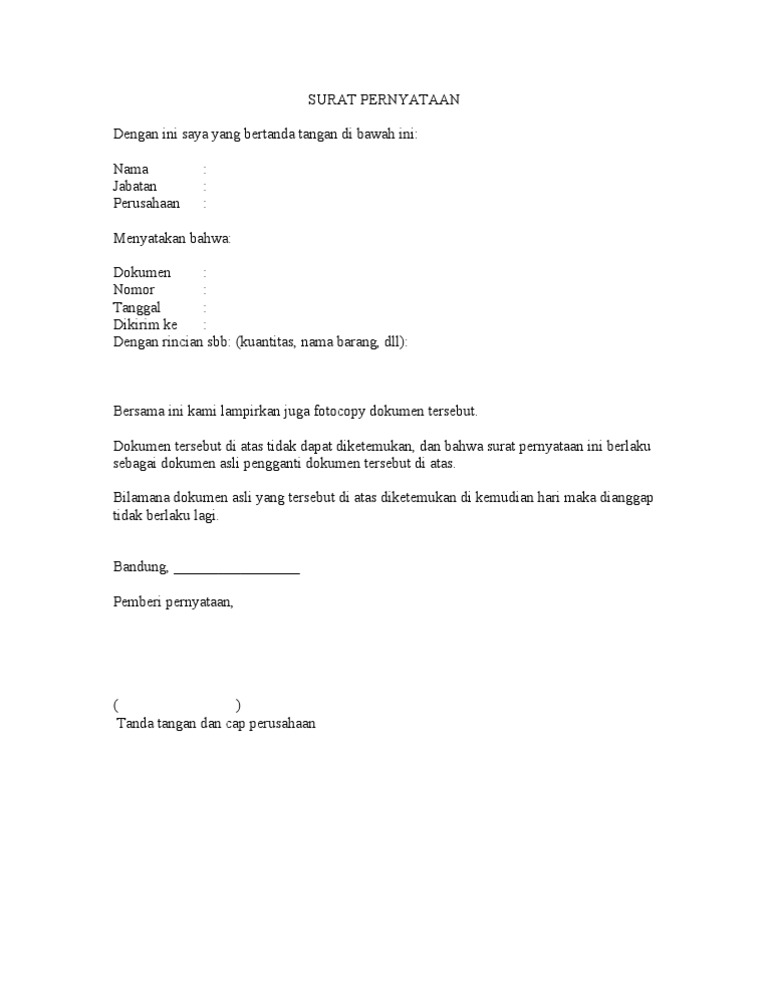 Karena surat pernyataan kehilangan juga termasuk ke dalam surat resmi, maka anda harus menggunakan bahasa resmi atau baku yang memang sudah sesuai dengan eyd. Bersama ini kami lampirkan juga fotocopy dokumen tersebut. Tandai sebagai konten tidak pantas. Surat pernyataan kehilangan stnk berikut ini anda bisa lansung copypaste contoh surat pernyataan kehilangan stnk, bpkb, sim ini untuk kelengkapan Kehilangan bpkb / stnk pelapor membawa : Surat pernyataan yang bertanda tangan dibawah ini saya : Setiap musibah yang datang memang tak dapat kita hindari dan itupun bukan atas kehendak kita. Simpan surat pernyataan kehilangan dokumen asli untuk nanti. Sedangkan orang terdekat yang juga bisamembuat surat pernyataan kehilangan ialah kepala desa ataupun rt anda, tergantung dengan barang atau dokumen apa yang hilang. Namun karena saya baik saya ingin memberi 7 contoh surat pernyataan yang bisa kamu contek. Menyatakan bahwa saya telah mengalami kehilangan/kerusakan buku polis dan mohon dapat dilakukan pencetakan ulang atas kehilangan/kerusakan tersebut diatas. Bersamaan dengan pengiriman/penyerahan surat pernyataan ini. Related image with contoh surat penting surat pernyataan kehilangan dokumen asli.